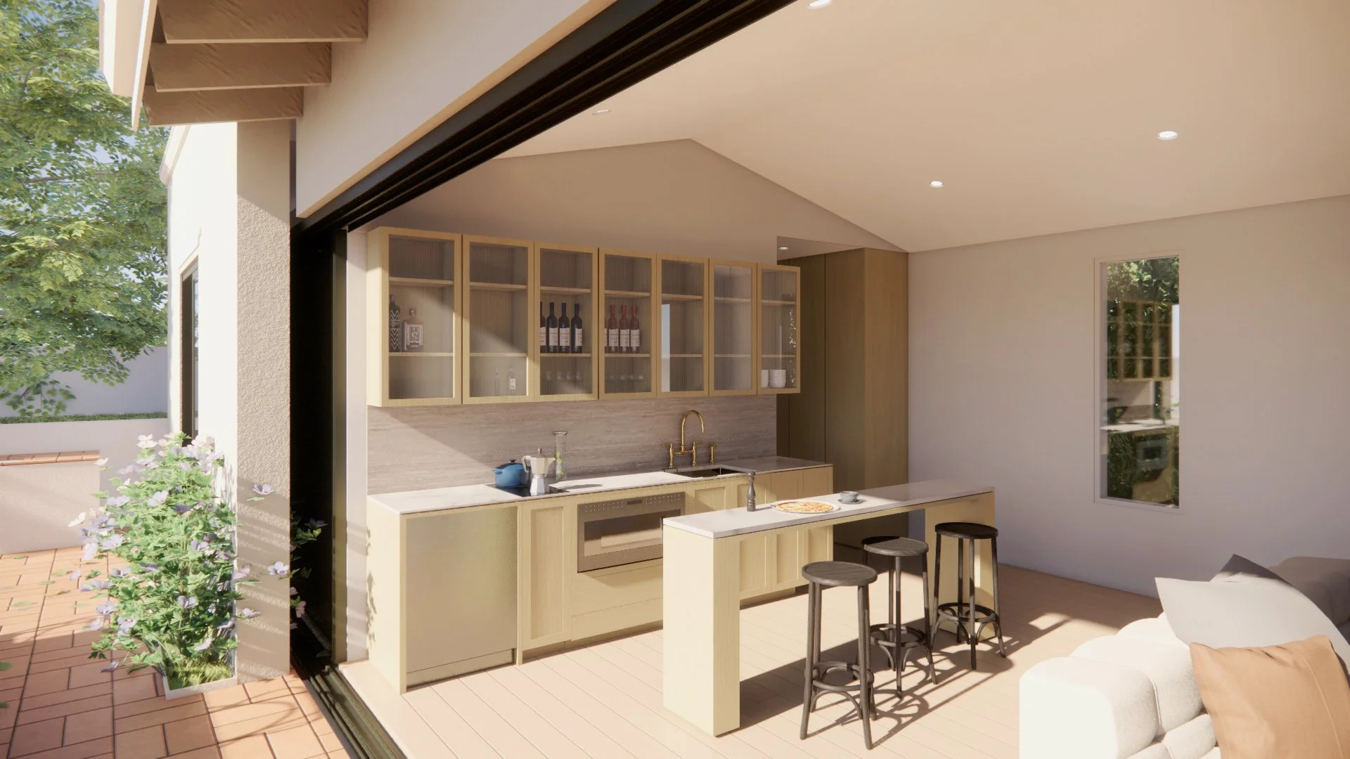 This rustic-modern guest house doubles as a pool house, designed for the owner's family to enjoy summer days by the pool. Prioritizing seamless connectivity, the design incorporates a four-paneled pocket sliding door. When fully opened, it blurs the boundary between the pool house and the pool deck, merging the two spaces into one. This creates a refreshing indoor-outdoor environment, perfect for relaxation and family gatherings.
